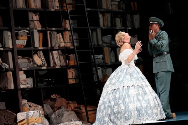 Die Inszenierung von Mariame Clément zeigt keinen plüschig-romantisierten Orient, sondern spielt in einem totalitären Staat. Da stolzieren wie ein Weihnachtsbaum behangene Militärs über die Bühne, die im richtigen Moment auch mal zur Maske greifen und so zu einem der derzeit weltweit regierenden Schurkenpräsidenten werden (Trump, Erdogan, Orban usw.), da bereitet uniform gekleidetes Volk den Blumenschmuck für die Ankunft des Machthabers vor und die Revolutionäre tragen brav ihren Arafat-Schal. Das Zusammentreffen dieser Gruppen setzt Clément mit guter Personenführung in Szene, wobei jedoch gerade die großen Szenen oftmals schnell zu einem Tableau werden in dem dann nur noch wenig passiert. Ausgesprochen charmant sind Szenen, die ein bisschen mehr theatrale Anarchie wagen, wie etwa der absurd überzeichnete Revue-Auftritt des Großmoguls. Dabei scheut Clément keineswegs den Humor und das Publikum lacht immer wieder herzlich. Bleibt der erste Akt noch etwas langatmig, geraten der zweite und dritte flott und unterhaltsam auch wenn hier und da sicherlich noch die ein oder andere Pointe möglich gewesen wäre. Ausstatterin Julia Hansen liefert eine detailverliebte Bühne, die von repräsentativen Räumen mit leichtem DDR-Charme auf ein riesiges, staubiges Archiv (samt tölpeligem Archivar) wechselt, in deren Mitte der neue „Thronsaal“ in Form einer Hundehütte steht. Hansen, die auch für die Kostüme verantwortlich ist, greift hier zu zweckdienlichen Outfits, scheut sich aber auch nicht von einigen schrillen Akzenten, die ebenfalls für den ein oder anderen Lacher gut sind.