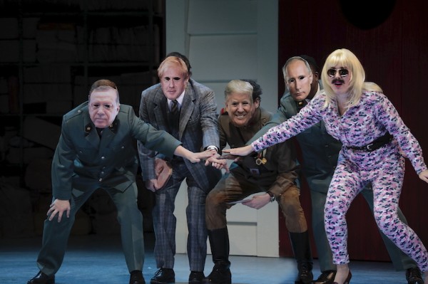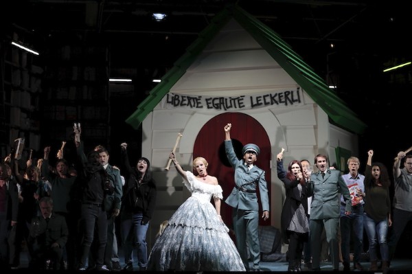 Die Inszenierung von Mariame Clément zeigt keinen plüschig-romantisierten Orient, sondern spielt in einem totalitären Staat. Da stolzieren wie ein Weihnachtsbaum behangene Militärs über die Bühne, die im richtigen Moment auch mal zur Maske greifen und so zu einem der derzeit weltweit regierenden Schurkenpräsidenten werden (Trump, Erdogan, Orban usw.), da bereitet uniform gekleidetes Volk den Blumenschmuck für die Ankunft des Machthabers vor und die Revolutionäre tragen brav ihren Arafat-Schal. Das Zusammentreffen dieser Gruppen setzt Clément mit guter Personenführung in Szene, wobei jedoch gerade die großen Szenen oftmals schnell zu einem Tableau werden in dem dann nur noch wenig passiert. Ausgesprochen charmant sind Szenen, die ein bisschen mehr theatrale Anarchie wagen, wie etwa der absurd überzeichnete Revue-Auftritt des Großmoguls. Dabei scheut Clément keineswegs den Humor und das Publikum lacht immer wieder herzlich. Bleibt der erste Akt noch etwas langatmig, geraten der zweite und dritte flott und unterhaltsam auch wenn hier und da sicherlich noch die ein oder andere Pointe möglich gewesen wäre. Ausstatterin Julia Hansen liefert eine detailverliebte Bühne, die von repräsentativen Räumen mit leichtem DDR-Charme auf ein riesiges, staubiges Archiv (samt tölpeligem Archivar) wechselt, in deren Mitte der neue „Thronsaal“ in Form einer Hundehütte steht. Hansen, die auch für die Kostüme verantwortlich ist, greift hier zu zweckdienlichen Outfits, scheut sich aber auch nicht von einigen schrillen Akzenten, die ebenfalls für den ein oder anderen Lacher gut sind.
