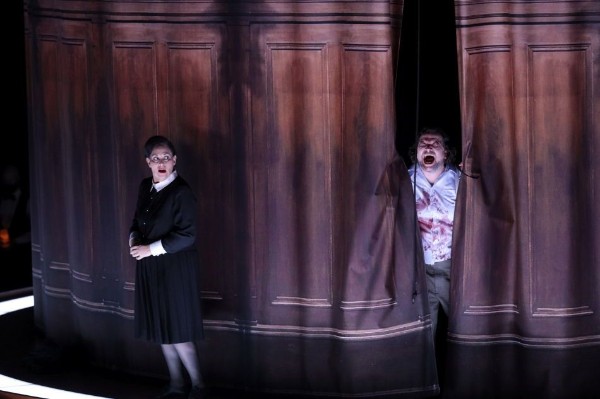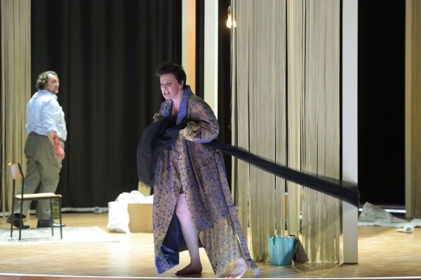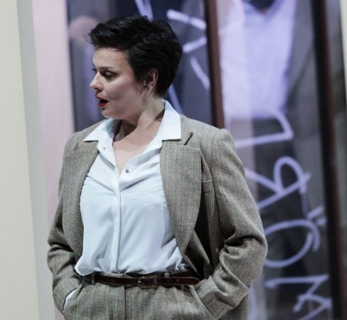 Im ersten Bild setzt sich die israelische Mezzosopranistin Dalia Schaechter, seit 2008 Kammersängerin der Kölner Oper, als Brigitta im schwarzen Kleid (Kostüme: Silke Willrett) mit weißem Kragen die Maske von Marie auf, wird zu ihrer Stellvertreterin, der Bewacherin der Treue ihres Ehemanns, schließlich zu ihrem Alter Ego. Ein Bild von Marie wird an die Wand projiziert. Der international renommierte Heldentenor Burkhard Fritz, der sowohl das italienische als das französische Fach singt und auch in Wagnerpartien brilliert, erscheint als Paul in weißem Hemd, leger gekleidet, ohne Schuhe, rundlich, vom Aussehen scheinbar unpassend für die Rolle des trauernden Witwers, durch die sehr entstellende Kleidung.
