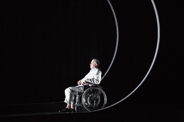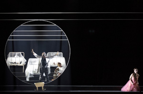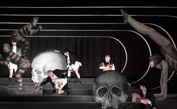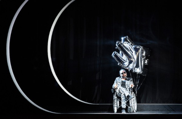 Da Corona bedingt kein Chor auf der Bühne singen und agieren kann, hat sich Regisseur Johannes Erath einige Statisten (ergänzt durch Mitglieder des Opernstudios) zur Hilfe genommen, die die Szenerie beleben sollen und da kommen wir zu einem der Probleme des Abends: Die Regie. Erath möchte über die Grenzen zwischen Leben und Tod reflektieren über die Vergänglichkeit und die Frage, wie der Mensch sein Leben am Ende resümiert. Ein interessanter Ansatz, der sich aber leider nur bedingt erzählt. Erath ergeht sich in vielerlei platter Symbolik wie etwa dem von ihnen verspiegelte Sarg, dessen Deckel dem Publikum vor die Nase gehalten wird, die Wiege, auf die der Sargdeckel direkt passt und der große Schriftzug „Adieu“ bei dem das I – ja, wir ahnen es schon – ein Sarg ist. Dabei hat Bühnenbildner Herbert Murauer eine geniale Bühne erschaffen, die Assoziationen einer Kameralinse, einer Fokussierung (auf das Wesentliche?) zulässt und in beeindruckender Weise wie von Zauberhand Versatzstücke erscheinen und verschwinden können.