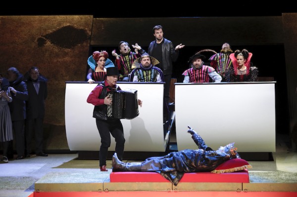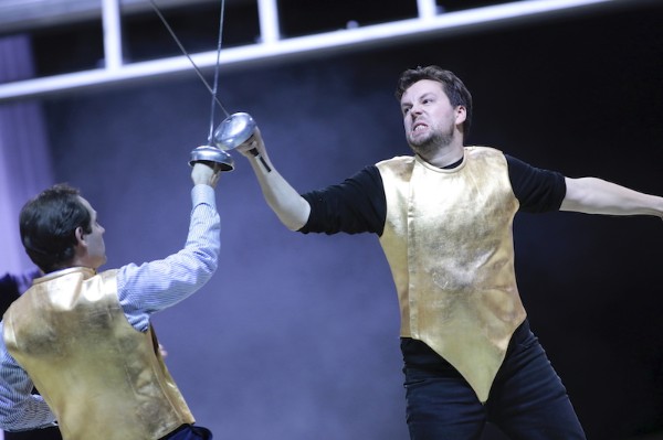 Was der Komponist seinen Sängern in dieser Oper abverlangt ist teilweise mörderisch. Gerade die Titelpartie des Hamlets ist ein Kraftakt, den David Butt Philipp absolut souverän stemmt. Mit ungeheurer Strahlkraft vermag er es immer wieder sich gegen den großen Orchesterapparat durchzusetzen, ist in allen Lagen seiner Stimme vortrefflich, nuanciert fein und verkörpert fast beängstigend gut die Raserei des Dänenprinzen. Ihm zur Seite als Ophelia präsentiert sich Gloria Rehm, die ihre Partie ebenfalls exzellent meistert. Im Spiel von Schmermut und Verzweiflung getrieben, zeigt sie ein beeindruckendes Rollenportrait. Andrew Schroeder als Claudius ist ein großartiger Gegner für Hamlet – zwischen Schuld und Machtgier hin- und hergerissen überzeugt er auch musikalisch auf ganzer Linie. Dalia Schaechter, mittlerweile ein Urgestein des Kölner Ensembles, hat mit der Rolle der Getrud etwas bekommen, was ihr scheinbar auf den Leib geschrieben zu sein scheint. Ihre Stimme passt wunderbar in die Rolle der reifen Königin, sie spielt die Partie mit Noblesse, aber auch mit tiefer Sorge um Sohn und Königreich. John Heuzenröder als Polonius glänzt mit tenoralem Glanz und weiß auch szenisch durchaus zu überzeugen. Joshua Bloom, der neben den kleineren Partien als Player und Gravedigger vor allen Dingen in als Geist von Hamlets Vater, wie Fährmeister Charon auf einem kleinen Kahn daherkommend, begeistert mit einem sonoren, tiefgründigen Bass, der für diese Rolle einfach ideal ist. Dino Lüthy als Laertes singt die eher kleine Partie klangschön und beeindruckt im Finale der Oper mit einem angsteinflößenden Fechtkampf mit Hamlet, der einem das Blut in den Adern gefrieren lässt. Als Rosencrantz und Guildenstern stehen die beiden Countertenöre Patrick Terry und Cameron Shabazy auf der Bühne. Beide singen ihre Partien mit großer Akkuratesse, jedoch – und da kann man den beiden keinen Vorwurf machen – haben ihre wunderschönen, zarten Stimmen immer wieder Probleme gegen den monströs tobenden Orchesterapparat anzukommen. Als Player überzeugen Sergey Kaydalov, Jan Rusko und Samuel Levine, die mit der herrliche überzeichneten Theatervorstellung gekonnt auch einen humorvollen Akzent setzen. Insgesamt zeigt sich eine Ensembleleistung auf höchstem Niveau, die mit großer Emotionalität und mit sehr fein erarbeiteten Charakteren das Publikum wirklich fesselt.