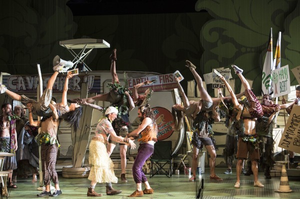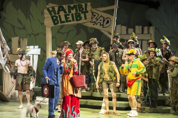 Die Regie zeigt im opulenten Bühnenbild und mit den detailverliebten Kostümen von André Barbe reichlich Einfallsreichtum und eine gute Personenführung. Ein spielfreudiges und bestens aufgelegtes Ensemble zeigt eine Leistung, die – blendet man den Hambacher Forst aus – Laune macht. Ein paar Wortwitze, ein paar Seitenhiebe auf die Kölner Politik, Satire auf Lobbyisten, Öko-Siegel (der goldene Frosch), political correctness und natürlich auch Klüngel – alles eigentlich nicht schlecht und auch amüsant. Vor dem Hintergrund der Aktivistenkommune werden die Figuren sauber und detailreich gezeichnet und das Publikum kichert und schmunzelt auch immer wieder vergnügt. Die schwungvollen und passenden Choreographien von Cécile Chaduteau lockern die Szenerie obendrein mit einem wunderbaren Tanzensemble auf.