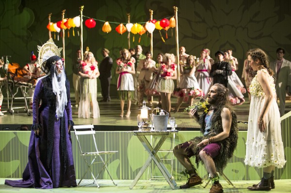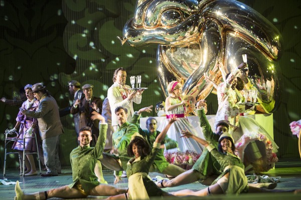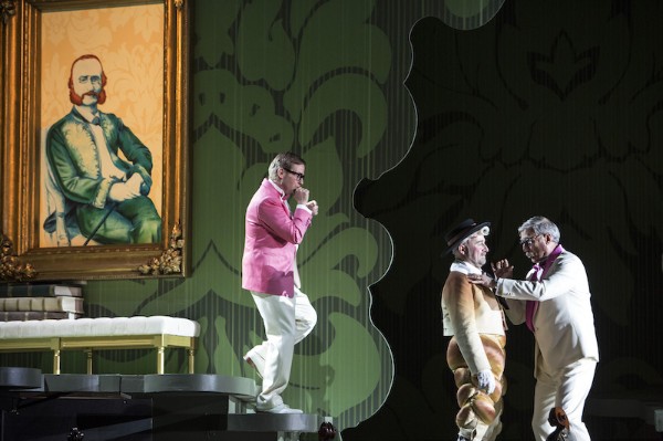 Eine Seite des Abends die aber uneingeschränkt zu überzeugen vermag ist die der Musik. Allen voran sei Jennifer Larmore zu nennen, die in der Titelpartie voll und ganz überzeugt. Im Spiel mit viel Esprit und an den richtigen Stellen unglaublich witzig zeigt sie auch stimmlich, wie fein und raffiniert sie Offenbach musizieren kann. Ihr zur Seite steht als Fritz der Tenor Dino Lüthy der mit Bart und Langhaarperücke einen charmanten Hippie gibt und alle Tücken der Offenbachschen Musik exzellent meistert. Klangschön und präzise setzt er jeden Ton. Emily Hindrichs als Wanda ist hervorragend besetzt und meistert die Partie absolut souverän. Miljenko Turk als Baron Puck, herrlich schmierig im Anzug als Lobbyist, sorgt nicht nur für Lacher, sondern überzeugt mit großer Spielfreude auch stimmlich absolut. John Heuzenröder als langweiliger Prinz Paul – hier der Erbe einer Bäckereikette in einem witzigen Kostüm, das an goldbraun gebackene Brötchen erinnert – spielt seine Rolle souverän. Vincent le Texier als General Bumm verkörpert den militärischen Haudegen glaubwürdig. Der Chor der Kölner Oper überzeugt auch in dieser Produktion wieder voll und ganz. Am Ende der Spielzeit muss hier einmal gesagt werden, dass dieser so entscheidende Klangkörper in der auslaufenden Saison wirklich Überragendes geleistet hat und sich unter der Leitung von Rustam Samedov unglaublich positiv entwickelt hat: Bravo! Große Spielfreude, Engagement und vor allen Dingen ein wirklich so sauberer und wohl ausgewogener Klang überzeugen auf ganzer Linie.