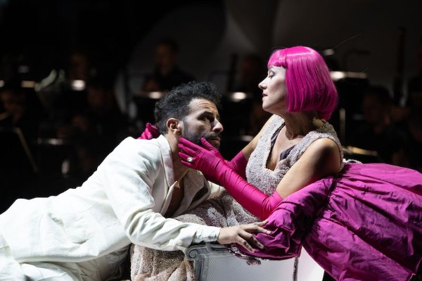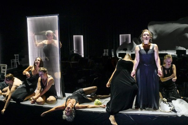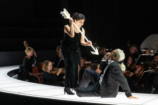 Bemerkenswert an diesem Abend ist zunächst das Setting, das sich Bühnenbildnerin Heike Scheele ausgedacht hat. In der Mitte der Bühne sitzt das Orchester, stets sichtbar. Um das Orchester herum, ein drehbarer Ring, der sich zu den Rändern der Bühne an Podien und Ränge anschließt, die an antike Tempel erinnern, aber auch die Assoziation eines Amphitheaters, ja einer Manege zulassen. Das ist zweckdienlich und sieht imposant aus, präsentiert sich aber für die Musik ausgesprochen vorteilhaft, für die Szene leider als hinderlich. Eine wirkliche Spielfläche ist eben nur der laufstegartige Ring um das Orchester und eine kleine Fläche an der linken Seite (rechts sitzen ja die Harfen). Regisseur Johannes Erath müht sich hier redlich Figuren Leben einzuhauchen, lässt immer wieder in der Form von Statisten eine ganze Göttergesellschaft durch den Abend gleiten, aber das Geschehen rutscht immer wieder sehr ins Statische ab. Das, was aktiv ist, das ist das Orchester und das wird aufgrund dieser Positionierung auch zum Hauptakteur. Gerade der erste Teil gerät so zu einer fast semikonzertanten Fassung. Im zweiten Teil bessert sich dies deutlich, die Chöre werden aktiver, die Figuren bekommen mehr Kontur, das Treiben wird lebendiger.