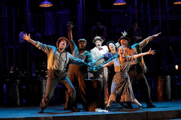 Die Inszenierung von John Fulljames (Regie-Mitarbeit Lucy Bradley) erzählt die Geschichte schlüssig. Sicherlich meidet die Regie jeglichen sozialen Sprengstoff, den dieses Stück zu bieten hätte (Migration, häusliche Gewalt, Armut usw.) und legt den großen Weichzeichner über alles und so entsteht ein Sittengemälde mit allzu romantisierender Patina. Das Bühnenbild ist so hübsch rostig, die Kostüme sind so hübsch pastellig – aber sei es drum: Der Abend ist dennoch eine Wucht. Sicherlich ist es bei diesem Werk legitim, gerade weil es die Musik mit ihrem Swing und Jazz eben so hergibt, den Fokus auf das Unterhaltende zu legen. Und das macht die Regie eben ganz ausgezeichnet. Die von Dick Bird entworfene Bühne ist ein Gewirr aus Treppen und Balkonen, aus Gittern und Stiegen, ebenso, wie man das Feuerleitergewirr eines typischen New Yorker Mietblocks kennt. Und in diesem Labyrinth hat die Regie einen Reigen teils skurriler, teils ganz gewöhnlicher Menschen angesiedelt. Die großen und kleinen Geschichten spielen sich hier ab und lassen ein mitreißendes Gesamtbild entstehen. Die Choreographien von Arthur Pita ergänzen die Szenerie adäquat und bringen echtes Broadway-Flair ins Staatenhaus.