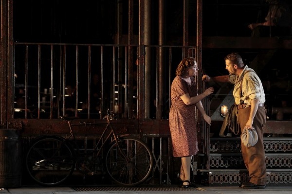 Die Inszenierung von John Fulljames (Regie-Mitarbeit Lucy Bradley) erzählt die Geschichte schlüssig. Sicherlich meidet die Regie jeglichen sozialen Sprengstoff, den dieses Stück zu bieten hätte (Migration, häusliche Gewalt, Armut usw.) und legt den großen Weichzeichner über alles und so entsteht ein Sittengemälde mit allzu romantisierender Patina. Das Bühnenbild ist so hübsch rostig, die Kostüme sind so hübsch pastellig – aber sei es drum: Der Abend ist dennoch eine Wucht. Sicherlich ist es bei diesem Werk legitim, gerade weil es die Musik mit ihrem Swing und Jazz eben so hergibt, den Fokus auf das Unterhaltende zu legen. Und das macht die Regie eben ganz ausgezeichnet. Die von Dick Bird entworfene Bühne ist ein Gewirr aus Treppen und Balkonen, aus Gittern und Stiegen, ebenso, wie man das Feuerleitergewirr eines typischen New Yorker Mietblocks kennt. Und in diesem Labyrinth hat die Regie einen Reigen teils skurriler, teils ganz gewöhnlicher Menschen angesiedelt. Die großen und kleinen Geschichten spielen sich hier ab und lassen ein mitreißendes Gesamtbild entstehen. Die Choreographien von Arthur Pita ergänzen die Szenerie adäquat und bringen echtes Broadway-Flair ins Staatenhaus.