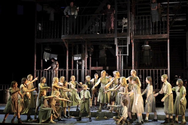 Sage und Schreibe 42 Rollen weist der Besetzungszettel auf, ergänzt durch Tänzer, Chor und Kinderchor. Alle zusammen zeigen eine umwerfende Ensemble-Leistung, die trotz großer Exaktheit eine Leichtigkeit atmet, wie man sie sich nur wünschen kann. Dass so etwas gelingt ist sicherlich auch Verdienst derer, die ob der Überschaubarkeit ihrer Rolle im Weiteren nicht namentlich genannt werden können. Aber natürlich gibt es auch einige Partien, die eben aus der große Street-Szenerie herausragen. Allen voran ist Allison Oakes zu nennen, die in der Rolle der unglücklichen Anna Maurrant zu Höchstform aufläuft. Dramatisch in Stimme und Spiel begeistert sie das ausverkaufte Staatenhaus. Ihr zur Seite steht Emily Hindrichs als Tochter Rose Maurrant. Auch sie präsentiert eine vortreffliche Interpretation ihrer Rolle. Zart, hin- und hergerissen zwischen Familie und dem Leben woanders, zwischen der Liebe und dem Gehorsam zeigt sie stimmlich ein weiteres Mal, was für ein Glücksfall sie für das Kölner Ensemble ist. Aus selbigem finden sich auch zahlreiche „alte Bekannte“ wieder, wie Dalia Schaechter als herrlich schrullige und vertratschte Emma Jones , Claudia Rohrbach als quirlige Greta Fiorentino, Adriana Bastidas-Gamboa als nicht ganz typgerecht besetzte, aber szenisch und gesanglich komplett überzeugende schwedische Einwandererin Olga Olsen und Alexander Fedin als grantelnder Abraham Kaplan. Sicherlich besonders bemerkenswert sind die gesanglichen Leistungen von Jack Swanson als Sam Kaplan und Martin Koch als Lippo Fiorentino. Beide überzeugen mit ausgesprochen klangschönen Stimmen und erfüllen ausgezeichnet die Gradwanderung zwischen großer, dramatischer Oper und Swing. Lobend seien auch explizit die Kinderdarsteller auf der Bühne genannt, die sich frech und mit viel Spaß an der Sache in ihre Rollen werfen und gesanglich, wie auch in den Sprechtexten absolut überzeugen und die Herzen der Zuschauer im Sturm erobern. Der von Rustam Samedov einstudierte Chor klingt exzellent und meistert seinen Part souverän.