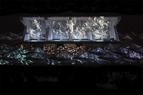 Dabei hat Bühnenbildner Darko Petrovic dem Orchester auch einen raffinierten und guten Platz zugewiesen und dabei auch mal die räumlichen Möglichkeiten des Provisoriums im Staatenhaus sehr gut ausnutzend. Zentrum des Bühnengeschehens ist ein Bruchstück aus einem Schiff, das mit seinen vier Kabinen das Orchester überragt. Umrahmt wird dies von gestaffelten, dreieckigen Projektionsflächen, auf denen je nach Situation Gischt des fahrenden Schiffes, Wellen oder auch mal der Blick in ein Haifisch-Becken zu sehen ist, gleichsam einem abstrahierten Ozean. Petrovic Bühnenbild ist für das Stück eigentlich wunderbar, dient es doch der Handlung und schafft durch seine omnipräsente maritime Note einen wirklich ausgesprochen gelungenen Rahmen für die Handlung. Die leicht folkloristisch angehauchten Kostüme von Annina von Pfuel unterstreichen diesen Rahmen stimmig.