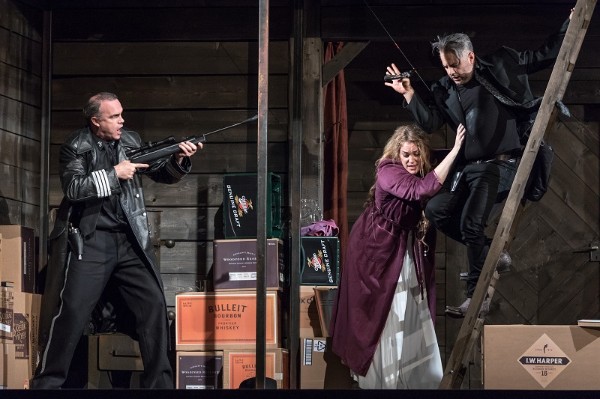 Zur Zeit des Goldrauschs spielt die Handlung des Werkes, ist also Mitte des 19. Jahrhunderts im südlichen Kalifornien zu verorten. Regisseur Cusch Jung verlegt sie ans Ende des 20. Jahrhunderts, vielleicht sogar noch später, denn im letzten Akt ist eine Wand zu sehen, die die Grenzmauer zu Mexiko darstellen könnte (doch niemand hat ein Smartphone?!). Aus den Goldgräbern sind herkömmliche Grubenarbeiter geworden, die ihre Schätze in einem Tresor aus den 1950er Jahren horten, der mit einem Aufzug im Boden der Umkleide der Arbeiter versenkt werden kann. Minnies Hütte dient der Wirtin gleichsam als Lager für die zahlreichen Alkoholika, die sie ausschenkt, und wird wie in einem Guckkasten in die Bühne geschoben, während rundherum ein Schneesturm tobt. Die Kulisse bieten zusammen mit den so varianten- wie detailreich gearbeiteten Kostümen (für beides zeichnet die begabte Karin Fritz verantwortlich) nette Bilder, sind aber für Interpretationsansätze irgendwelcher Art, abgesehen von der erwähnten Grenzmauer, wenig geeignet. Eigentlich hätte alles auch in Cowboyhut und mit Pferden funktioniert, mehr als eine schlüssige Bebilderung leisten die Szenerie und die Lesart von
