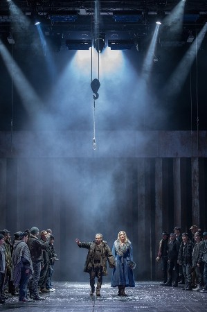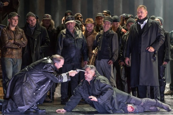 Bei einem eher selten gespielten Werk gibt es natürlich immer Rollendebütanten und so haben gestern gleich beide männlichen Hauptsänger ihre Charaktere erstmals verkörpert. Bariton Simon Neal startet als Sheriff Rance vergleichsweise zaghaft in den Abend, schwingt sich aber nach der Pause zu gewohnter Präsenz auf und gestaltet den Unsympathen als zerrissene Figur zwischen Machtgier, Rachsucht, Liebe und Hass. Sein voluminöse, kraftvolle Stimme verfügt über enorme Durchschlagskraft und so gerät seine Szene mit Minnie im zweiten Akt zu einem der Höhepunkte des Abends. Gaston Riveros Dick Johnson überzeugt mit unvergleichlicher Dolcezza und sicheren Höhen voller Strahlkraft, sein dunkel gefärberter Tenor hat etwas umschmeichelndes und man kann gut nachvollziehen, dass die unnahbare Minnie bei ihm ihr Frausein entdeckt. Die findet in der Sopranistin Megan Miller die ideale Gestalterin, eine warme, gefühlvolle Mittellage wird mit funkelnden und strahlenden Höhen gekrönt. Darstellerisch ist die Amerikanerin ohnehin der Star des Abends, nicht nur im eben schon erwähnten Spiel mit ihrem Gegenspieler Rance läuft sie zu Höchstform auf. Und auch in der zweiten Reihe gibt es keinen Grund zur Klage: Randell Jakobsh brilliert als Ashby mit imposantem Bass, Christiane Döcker gibt überzeugend die unsichere Indianerin Wowkle, Artur Mateusz Garbas ihren Geliebten, den minderbemittelten Billy. Ein Dutzend weitere Rollen verzeichnet der Besetzungszettel, die allesamt überzeugen können und von denen Patrick Vogel als Barkeeper Nick, Sejong Chang als imposanter Barde Jake Wallace und Tyler Clarke als bühnenpräsenter Harry den nachhaltigsten Eindruck hinterlassen. Die Herren des Chores der Oper Leipzig sind in diesem Werk viel beschäftigt, wurden von Alexander Stessin und Thomas Eitler-de Lint präzise auf ihre umfangreiche Aufgabe vorbereitet, so dass auch hier ein rundum überzeugender Eindruck bleibt.