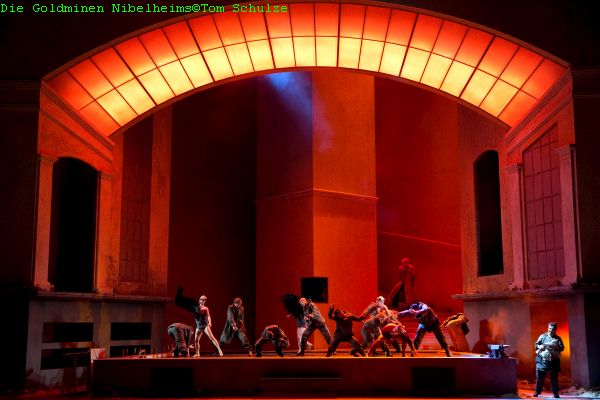 In der Mitte befindet sich noch eine geschwungene Treppe. In der Mitte der Bühne befindet sich ein etwa 80 cm hohes Podest, welches im ersten Bild als riesengroßes Wasserbecken den Rhein symbolisieren soll. Ein Sofa und ein Bett auf den von den Tänzern inzwischen trocken gewischten Beckenboden lässt Wotans Wohnzimmer erahnen. Die Götter erscheinen in eleganten Kleidern um 1900, die Riesen in englischem Tweed und hohem Top hat, und Loge erinnert in Kostüm und Bewegung an Charly Chaplin als Tramp (Kostüme: Nicola Reichert). Und durch eine Bodenluke steigen dann Wotan und Loge nach Nibelheim hinab. Im vierten Bild erscheint dann Erda in Begleitung der drei Nornen, die sie an den Schicksalsfäden mit sich zieht. Am Ende der Oper erscheint die Glasdecke des Raumes in den Regenbogenfarben, die in den vorhergehenden Szenen blau, weiß und rot beleuchtet war, die Götter steigen die Wendeltreppe empor während die Rheintöchter den Verlust ihres Goldes betrauern. Das Gewandhaus Orchester unter Ulf Schirmer bot ein Vorspiel vom Feinsten. Flotte Tempi kennzeichneten sein Dirigat und er scheute auch nicht davor zurück, an den passenden Stellen geradezu pathetisch aufspielen zu lassen. Die Blechbläser ließen einen imposanten Festungsbau erahnen, während die Holzbläser die Freude der Rheintöchter an ihrem Gold hörbar unterstrichen. Das tiefe Es in den Kontrabässen deutete gemeinsam mit den Pauken bereits eindrucksvoll das unheilvolle Ende der Tetralogie an. Michael Volle bestach als Wotan mit kräftigem Bariton. Er ist ein würdevoller Göttervater, nach dessen Gebot sich scheinbar noch alle richten. Aber die Stimmung ist am Kippen, das lässt seine beginnende Entfremdung zu Fricka bereits hier erahnen. Thomas Mohr als Loge gab ein Kabinettstück eines listigen, spitzbübischen Loge. Mit seinem beweglichen Tenor charakterisierte er diesen schleimigen Halbgott als raffinierten Gauner, dem niemand schaden kann, da alle auf die Kraft des Feuers angewiesen sind. Der in Kaliforniern geborene Bariton Anooshah Golesorkhi war ein polternder Donner mit gewaltiger Röhre und aufbrausendem Temperament. Der isländische Tenor Sven Hjörleifsson unterlegte mit seinem eher hellen Tenor einen gutaussehenden Gott Froh. Friedemann Röhlig war ein stimmgewaltiger Fasolt mit exzellent geführtem Bass während der ukrainische Bass Taras Shtonda als dessen Bruder Fafner zunächst im Hintergrund blieb, bevor er sich seines Bruders durch Mord entledigt hatte. Danach hatte er auch Zeit für ein witziges Zwischenspiel mit Fricka, die begehrlich ihre Finger nach dem Gold ausstreckte, um sich doch noch ein Stück davon zu ergattern. Werner Van Mechtelen war für den erkrankten Markus Brück als Alberich eingesprungen.