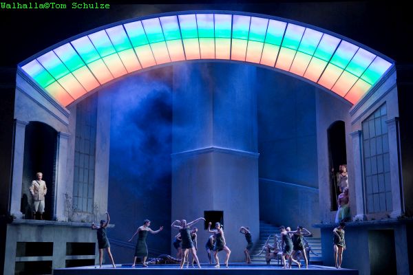 Den „legendären“ Herz-Ring aus DDR-Zeiten, von dem der Chefdramaturg der Oper Leipzig, Christian Geltinger, in seinem Einführungsvortrag gesprochen hat, habe ich leider nie gesehen und muss daher auch nicht das rituelle Bekenntnis zum Antifaschismus der damaligen Zeit an dieser Stelle reflektieren. Die englische Choreografin und Regisseurin Rosamund Gilmore (1.6.1955*) setzt Wagners Opus Magnum mit den Stilmitteln des Tanzes auf handwerklich faszinierende Weise um, indem sie die Handlung durch zwölf Tänzer als sogenannte „Mythische Elemente“ kommentierend umsetzen lässt und ebenso die Umbauten anstelle von Bühnenarbeitern durch sie bewerkstelligen lässt. Das mag zwar an manchen Stellen komisch wirken, aber ein bisschen mehr an Humor hat Wagner noch nie schaden können und immerhin dem Großteil des Publikums hat es auch an diesem Abend sehr gefallen! Alle vier Szenen des Vorspiels zeigen ein einheitliches romantisierendes Bühnenbild von Carl Friedrich Oberle mit einem riesigen Entrée, das an den Seiten von zwei Wänden begrenzt wird.