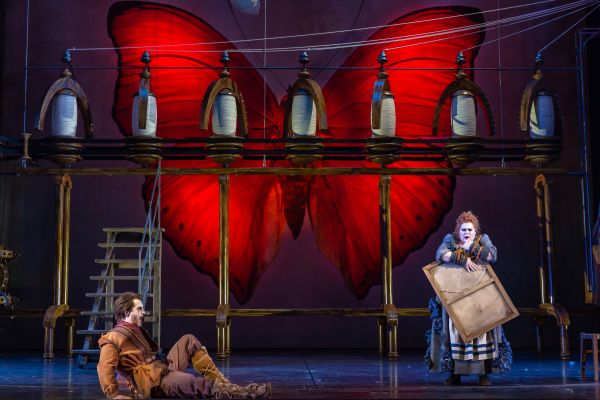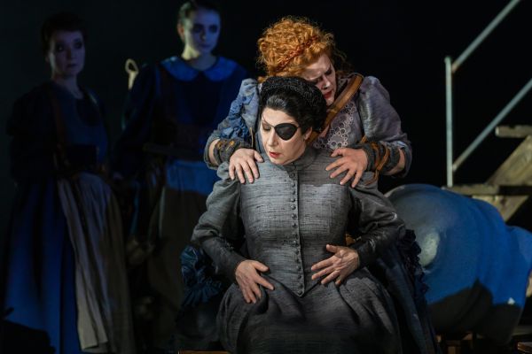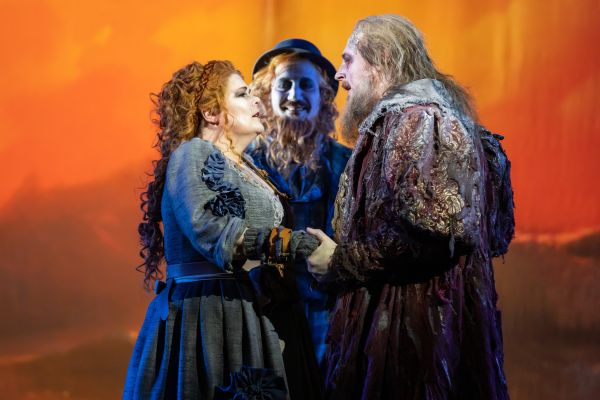 Somit war logischerweise für den zum Teil aufwendigen Bühnenaufbau von Michiel Dijkema und die opulenten Kostüme von Jula Reindell der historische Zeitbezug vorgegeben. So spielte der erste Akt auf dem Ufer, an dem nicht nur die Schiffe gestrandet, sondern auch verendete Wale angespült waren. Ein Kunstgriff der Regie hatte eines der Wal-Kadaver zum Schatz-Lager des Holländers gemacht, aufgelockert durch Kupferstiche vom Zuschauerraum eines zeitgenössischen Theaters.