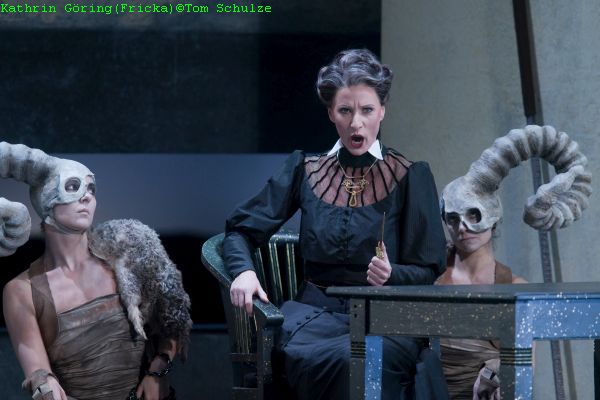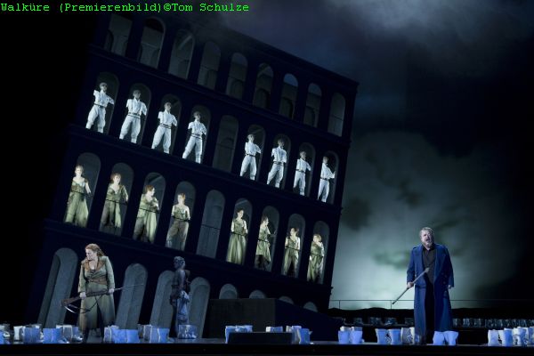Es wird düster am ersten Tag der Tetralogie. Rosamund Gilmores Walküre ist von düsteren Vorahnungen auf das Ende der Götter überschattet. Zu Beginn sehen wir Hundings Behausung mit einer bereits abgestorbenen Weltesche, in der das Schwert Nothung stakt und gleichzeitig als Kleiderhaken dient. Darüber hängt der Schädel eines Widders, Sinnbild für Fricka, die diese unglückliche Ehe von Hunding und einer von Schächern für ihn geraubten Frau beschirmt. Der Raum ist zunächst noch hoch und auf seinem Dach mit leuchtenden Gittern aus Stacheldraht sehen wir wieder die mystischen Figuren teils als Widder, teils als Wölfe und Raben verkleidet. Lichtgittern und Stacheldraht Langsam, wie von Zauberhand senkt sich der Plafond und wird zu einem bedrückenden Kellerraum mit der obligaten gewundenen Treppe nach oben. Bei Siegmunds „Winterstürmen“ öffnet sich die hintere Wand der Bühne, draußen herrscht aber auch keine Frühlingsstimmung oder gar der Lenz, vielmehr eine dunkelblaue, unwirtliche Kälte. Nachdem nun Siegmund den Namen von Hundings Gattin erhalten hat, gibt sich die bis dahin namenlose einsame Frau, im Wissen, dass der Fremde ihr verlorener Zwillingsbruder ist, gleich den zu „Siegmund“ passenden Namen, nämlich Sieglinde.