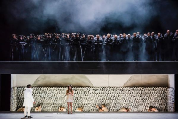 Dunkel, düster, pessimistisch, so wirkt Verdis "Don Carlo" in seiner Neuinszenierung an der Leipziger Oper; aber machen wir uns nichts vor, genau so ist dieses Große Stück mit seiner Unmenge an herrlicher Musik auch geschrieben. Muss das denn so sein, höre ich fragen, nicht unbedingt, doch es zeigt den Nerv des Stückes. Regisseur Jakob Peters-Messer ist hier eine ganz unspektakulär spektakuläre Inszenierung gelungen, die ganz aus Verdis Musik gearbeitet, das Ohr auf die Musik hinlenkt. Das trägt natürlich auch in der "kurzen", doch sehr geschlossenen Mailänder Fassung, was heißt ohne Fontainbleau-Akt. Dazu braucht es natürlich auch so ein starkes Bühnenbild, wie vom Markus Meyer, das seinen gewaltigen Anteil am Abend trägt: auf der großen Drehbühne finden sich große historisierende Architekturteile in finsterem Anthrazit, durch die Drehung werden immer neue Räume geschaffen, woran Guido Petzolds Lichtdesign seinen Anteil hat. Immer neue Räume öffnen sich , schliessen sich, Treppen laufen ins Nichts, Durchblicke suggerieren Grösse und Ferne, um klaustrophoben Kammern zu weichen. Die Welt des spanischen Hofes ist ein Labyrinth, aus dem sich nicht entkommen lässt. Sven Bindseils Kostüme zeigen in ihrem historisierendem Prunk keine wirklich konkrete, auch hier fast nur dunkle Töne, einzig der Infant Carlos ist in Weiß und wirkt dabei fast wie ein Pantalone, doch auch Posa versucht, in der rechten Beleuchtung, mit seinem gedeckten Blau auszubrechen.