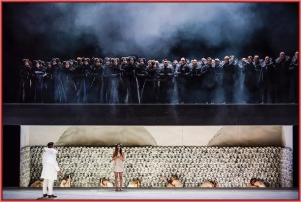 Peters-Messer hat dies geschickt gelöst, indem die beiden erst durch die Wand kommunizierten, und Eboli sich anschliessend immer hinter Säulen und Trennwänden mit dem Rücken zu Carlos gewandt bewegte. Auf Requisiten und Schmuck für die kahlen, schwarzen, fensterlosen Räume wurde weitgehend verzichtet. Einige schlichte, streng geradlinige Tische und Stühle genügten. An einer Wand hing eine gigantische, unheimliche, schwarze Skulptur. Erst dachte man, eines von HR Gigers Monster aus Ridley Scotts ALIEN sei im Escorial ausgesetzt worden, doch dann erkannte man darin eine Heuschrecke im letzten Larvenstadium, auch sie ein Symbol der Unterdrückung und Warnung, denn gemäss der Offenbarung des Johannes werden Heuschrecken alle Menschen, die nicht das Siegel Gottes auf der Stirn tragen, gnadenlos vernichten. Unter die Haut gehend war auch das grosse Tableau der Ketzerverbrennung, welche sich ebenfalls im Palast abspielte: Ohne aufgesetzten blutigen Aktionismus gelang dem Regisseur hier ein eindringliches Bild. Die Ketzer bewegten sich, als der Chor auf der Hebebühne hochfuhr, auf die unter diesem Boden zum Vorschein kommenden Totenschädel zu, verschmolzen quasi mit ihnen, das unendliche Märtyrertum setzte sich fort.
