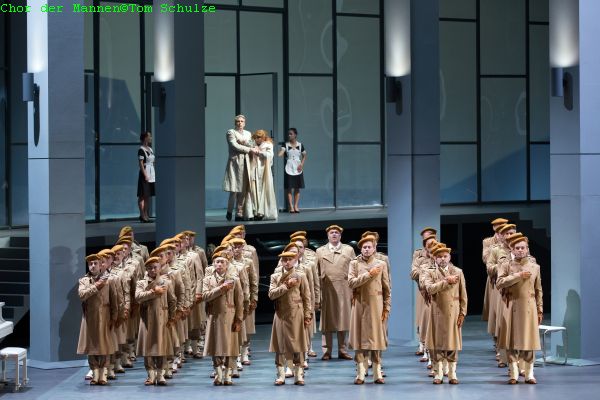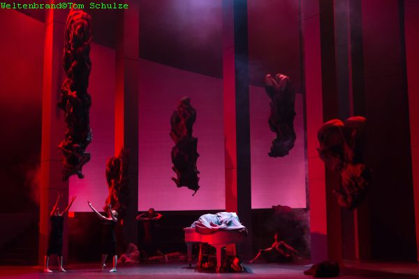 Die zweite Szene des Vorspiels spielt auf einem Balkon, der den Felsen Brünnhildes symbolisieren soll. Im ersten Akt rollen dann Tänzer einen weißen Konzertflügel im Zeitlupentempo in die Gibichungenhalle. Dieser fungiert dann im dritten Aufzug als Aufbahrungspodest für Siegfried und später als Scheiterhaufen, den Brünnhilde in ihrem Schlussgesang besteigt. Für den Speerschwur im zweiten Akt muss ein Stilett herhalten, das Hagen wie selbstverständlich bei sich im Gewand trägt. Mit diesem ersticht er dann auch Siegfried im dritten Aufzug, der auf einem Hirschkadaver liegend von der Bühne gezogen wird. Die beige gekleideten uniformierten Mannen Hagens tragen alle, mit Ausnahme eines, ein Barrett und rufen so Assoziationen an dunkle SA-schwangere Zeiten hervor. Nachdem Hagen auf der Szene erscheint, fand der ohne Kappe singende Chorist noch rasch Gelegenheit seine Mütze aufzusetzen. Dieser humorvolle Fauxpas erinnerte mich an die Gegenwart, wo manchen Menschen gar nicht bewusst ist, dass sie keinen Mund-Nasen-Schutz tragen. Am Ende der Oper versinkt der feuerrot leuchtende Flügel, auf dem Siegfried und Brünnhilde liegen, zusammen mit dem gesamten Personal, während schwarze Tücher vom Schnürboden fallen. Die Rheintöchter freuen sich über den wiedergewonnenen Ring und reißen Hagen mit sich in die Tiefen des Rheins.