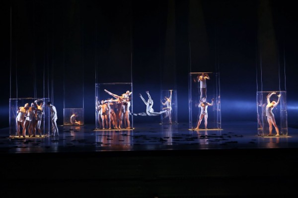Die Solotänzerinnen und Solotänzer auf der Bühne: Marcos Vinicius da Silva, Laura Costa Chaud, Luke Francis, Oliver Preiss, Urania Lobo Garcia und Lou Thabart. Dazu die ganze Ballett Compagnie Leipziger Ballett.