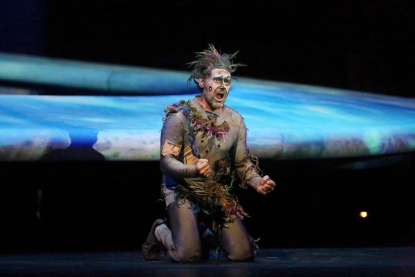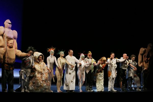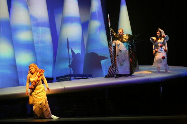 Der „Ring“ in Sofia hatte mit dem „Rheingold“ unter der Stabführung von Manfred Mayrhofer mit dem Orchester der Sofia Oper gestern Abend einen guten Start. Wir erblicken im Wesentlichen einen großen, beliebig variationsfähigen bühnengroßen Ring, einige kegelförmige Konusse, reduziert auf wesentliche symbolische Bedeutungen. Kartaloff setzt sie in ständiger Variation dramaturgisch ein, wobei Multimedia Design und Beleuchtung von Vera Petrova und Georgi Hristov sowie die Lichtregie Andrej Hajdinjak eine ganz entscheidende Rolle spielen. Es gelingt dem Regieteam, mit den Bühnenbildelementen und fantastischen Figurinen von Nikolay Panayotov und dem facettenreichen Multimedia-Design, den Mythos des „Ring“ mit einer nahe an Wagners Regieanweisungen operierenden Dramaturgie und ausgefeilten Personenregie mit großem Unterhaltungswert zu verbinden. Farbintensive und eindringliche Bilder sind da zu sehen, insbesondere die Regenbogenbrücke über die sieben hochstehenden Konusse auf dem Ring. Sie sehen wie Zinnen einer Burg, also Walhalls, aus.