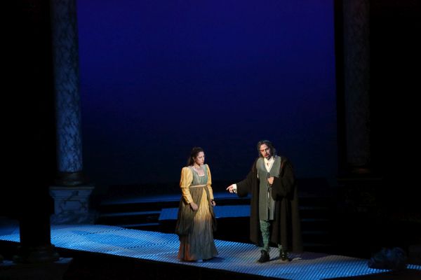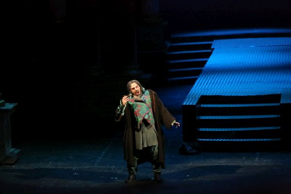 Lubomir Jordanov hat ein opulentes Bühnenbild für den Hof des Herzogs von Mantua aufgebaut, mit rötlichen monumentalen Säulen und goldenen korinthischen Kapitelen. Im Laufe des Abends werden diese Säulen immer wieder verschoben, um andere Bühnenausschnitte zu bilden. Die Hütte Sparafuciles wird lediglich durch eine alte, vom Schnürboden herunterkommende Türe charakterisiert. Die Kostüme von Elena Ivanova passen historisch zu diesen Bildern. Man merkt ohnehin gleich, dass es Kartaloff in erster Linie auf die Personenführung ankommt. Er zeichnet den Hofnarren wohl genauso, wie Verdi ihn sich vorgestellt haben könnte, als von der Hofgesellschaft diffamierten Krüppel, der innerlich verzweifelt seine Späße“ am Hof treibt, aber im Grunde nur das eine vor Augen hat, das Wohlergehen seiner Tochter Gilda.