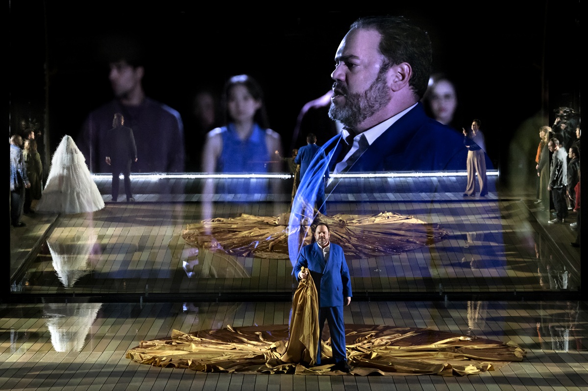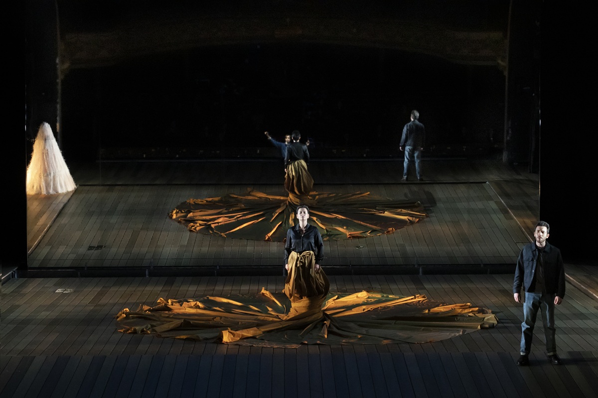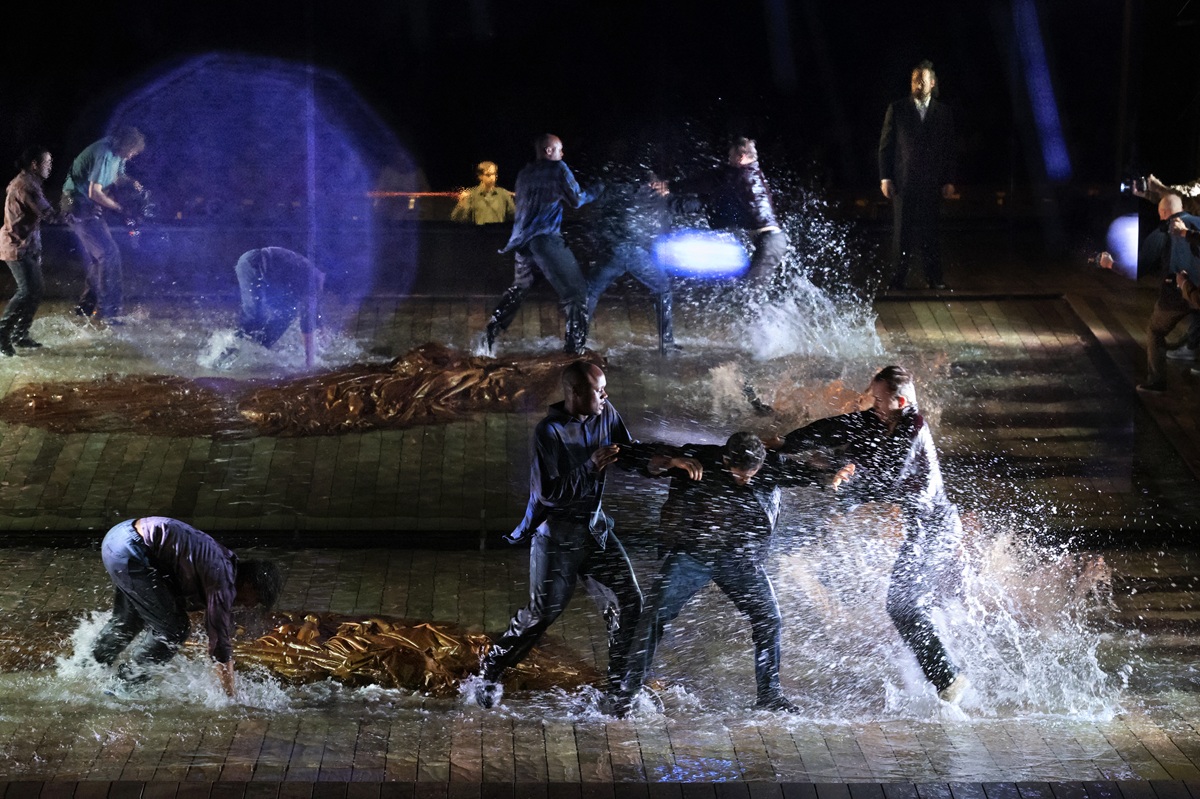 Gesichtslos hingegen werden die Frauen, die wie Königstochter Fenena, entführt und zur Braut wider Willen werden – sie sind mit überdimensionalen Schleiern bedeckt, was sie wirklich bewegt, wird nur in den erwähnten Nahaufnahmen sichtbar. Den Bühnenboden bedeckt eine Art Teich in der, zur riesigen Rosette aufgeschwungen, der Königsmantel liegt, den sich auch Abigaille immer mal wieder um die Hüften schwingt. Durch das Wasserelement bekommen Kampfszenen eine zusätzliche Dynamik. So wechselt Christiane Jatahy gekonnt zwischen statischen und hochenergetischen Momenten und schafft einen Musiktheaterabend, der Gänsehaut macht.
