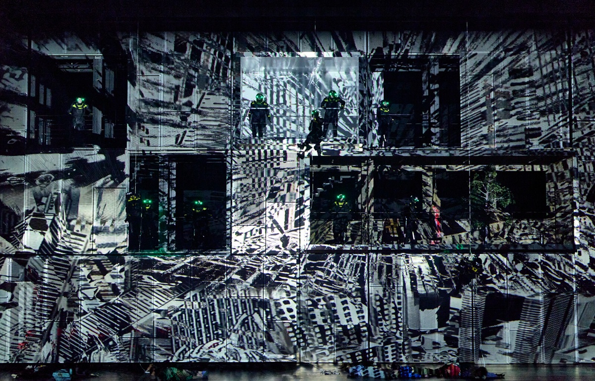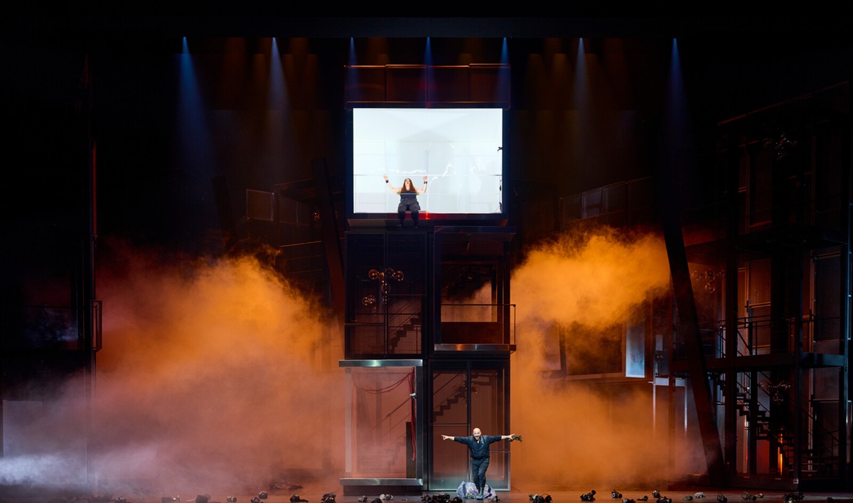 Computerraum als Walkürenfelsen: Tamara Wilson nun als Brünnhilde-Catcherin und Christopher Maltman als Wotan, der beim Abschied ein Freudentänzchen zwischen den Gasmasken macht (und stimmlich die Vorstellung rettete).