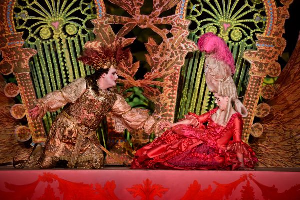 Die Musik von „Le Postillon de Lonjumeau“ – von dem es zum Glück einige Aufnahmen gibt – ist ganz anders als die symphonischen Ballette Adams, die Tschaikowsky zu seinen großen Handlungsballetten inspiriert haben. Es ist eine leichte Musik, im Sinne von Hérold, Boieldieu, Auber und Halévy, von denen wir schon einige opéras comiques rezensiert haben. Nur – wegen des Sujets – mit vielen Anleihen an die französische Musik des 18. Jahrhunderts, worunter zwei Opern von Rameau und Grétry, die im „Postillon“ aufgeführt werden. Sébastien Rouland, jetzt GMD in Saarbrücken, ist der ideale Dirigent für dieses Werk. Er weiß mit dieser Musik subtil umzugehen, gibt jeder Reprise eine andere Farbe – es gab nicht einen einzigen Strich in Wort und Ton – und weiß dem Orchester und Chor der Opéra de Rouen Normandie nicht nur „raffinement“, sondern auch „esprit“ (Witz) und Spielfreude ein zu flössen. Einfach herrlich und erfrischend. Michel Fau steht ihm als kongenialer, witziger und einfallsreicher Regisseur zur Seite. Fau ist ursprünglich Schauspieler und Theaterregisseur und weiß aus jeder noch so kleinen Sprechszene ein Maximum heraus zu holen. Jede Figur ist genau charakterisiert und auch wenn fast gar nichts passiert und Fau als Hofdame Rose in einem riesigen rosa Kleid stumm ins Publikum guckt, kann dieses sich vor Lachen kaum halten. Bevor der erste Ton gesungen war, war diese Premiere schon ein Erfolg.
