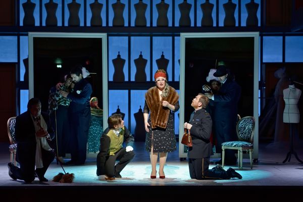 Das Singen war genauso gut wie das Spielen. Marion Lebègue überzeugte als omnipräsente Madame Favart in stets neuer Verkleidung. Der szenische und musikalische Höhepunkt des Abends war ihr Auftritt als alte, intrigante Tante Hectors, Madame de Montgriffon, die als Peggy Guggenheim mit markanter Brille und Schoßhund erschien – wir haben die Sängerin einfach nicht wiedererkannt. Auch stimmlich nicht, denn ihre Arie „Je passe sur mon enfance“ – für uns die schönste des Abends – lag deutlich tiefer als ihre anderen Arien. Damit hatte Juliette Simon-Gérard, die 19-jährige Sängerin der Uraufführung, offensichtlich kein Problem, doch die vielen Registerwechsel – und das viele Sprechen! – brachten Marion Lebègue an der Premiere öfters stimmlich aus dem Lot. Christian Helmer überzeugte alsCharles-Simon Favart in der bekannten Zuckerbäcker-Arie (Favart war wie sein Vater ursprünglich ein Zuckerbäcker gewesen) und trumpfte in den Tiefen mit sonorem Bass, aber dafür weniger in der Höhe. Da hatten es Anne-Catherine Gillet als Suzanne („einstimmig“ Spielsopran) und François Rougier als ihr Ehemann Hector de Boispréau (Spieltenor) viel leichter. Die drei buffonesken alten Männer – offensichtlich ein Thema für den alten Offenbach – beherrschten die Bühne, auch wenn sie vergleichsweise weniger zu singen hatten. Allen voran Eric Huchet, vor drei Wochen ein köstlicher Maître Péronilla (siehe unsere letzte Offenbach-Rezension) und nun ein umwerfend lustiger Marquis de Pontsablé, der als lüsterner Gouverneur und Baron Ochs avant la lettre der armen Justine nachstellt. Ihm ebenbürtig zur Seite Franck Leguérinel als Major Cotignac und Lionel Peintre als Biscotin – beide nicht mehr aus dem Ensemble der Opéra Comique wegzudenken. Der exzellent durch Edward Ananian-Cooper vorbereitete Chœur de l’Opéra de Limoges sang absolut textverständlich, auch in den vielen typischen Offenbach-gallops, die Kaiser Napoleon III zu seinem berühmten Bon Mot inspirierten, dass er Offenbach hauptsächlich „mit den Beinen höre“.