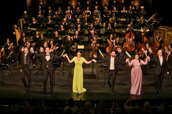 Beim Schlussapplaus: Thomas Dolié (Dicéphile), Cyrille Dubois (Nicias), Anne-Catherine Gillet (Phryné), Camille Tresmontant (Cynalopex), Anaïs Constans (Lampito) und Matthieu Lécroart (Agoragine + Le Héraut) vor dem Orchestre National d’Île-de-France und dem Choeur du Concert Spirituel.