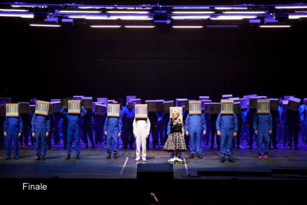 Im Finalbild sieht man das, was der Regisseur Francesco Micheli im Programmheft so beschreibt: „La fabbrica è metafora del cosmo ove ogni cosa es ogni individuo sono parte di un meccanismo perfetto.“ Candide von Leonard Bernstein, in dem es um das Ideal einer besseren Welt geht, spielt in dieser Produktion des Maggio Musicale Fiorentino in der Fabrik einer riesigen Speditionsfirma (Amazon??). Die Chor- und Statisterie-Massen sind von Anfang einheitlich in blaue Overalls gekleidet, ein Teil marschiert schon während des Vorspiels durch den Zuschauerraum auf die Bühne, sie verschieben ständig riesige Container oder kleine und große Pakete in militärisch anmutender Aktivität – offensichtlich beherrscht der „Apparat“ das gesamte Geschehen. Die grell kostümierten Hauptdarsteller sind skurril agierende Marionetten, nie entsteht zwischen den Figuren eine menschlich-berührende Beziehung – alles wirkt automatenhaft. Und am Ende sind dann alle Protagonisten – außer Voltaire – endgültig gleichgeschaltet, tragen ebenfalls blaue Overalls und Kartons über dem Kopf und sind offenbar Teil des vom Regisseur intendierten „perfekten Mechanismus“ einer Fabrik geworden. Ob sich das der große Individualist und ekstatische Romantiker des 20.Jahrhunderts Leonard Bernstein so vorgestellt hat??
