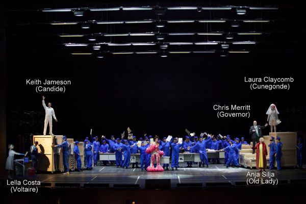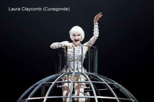Laura Claycomb war eine sichere Cunegonde, die den Schlager „Glitter and be gay“ gekonnt servierte und schöne Spitzentöne hören ließ. Die automatenhafte Inszenierung nahm der Rolle allerdings den jugendlich-unbefangenen Charme und Reiz. Ihr Bruder Maximilian war mit Gary Griffiths ebenso solid besetzt wie die Paquette mit der quirligen Jessica Renfro. Die zentrale Rolle des Candide war dem Buffo-Tenor Keith Jameson übertragen.