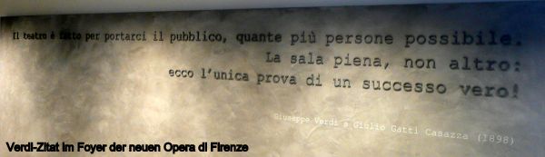 Wer Interesse am italienischen Operngeschehen hat, wird sich bei der Ortsangabe „Opera di Firenze“ wohl ein wenig wundern, denn als Opernhaus der toskanischen Hauptstadt galt bisher das Teatro Comunale. Doch dieses ist nun endgültig geschlossen (und angesichts seiner schlechten Akustik wird ihm auch keine Träne nachgeweint), und nach durch viele Schwierigkeiten (nicht zuletzt finanzieller Natur) immer wieder unterbrochener Bautätigkeit hat die Oper mit der Saison 2014/15 ihre laufende Tätigkeit aufgenommen. (Eine sogenannte Eröffnung im Dezember 2011 mit Beethovens „Neunter“ unter Zubin Mehta entsprach einem in Italien häufig geübten Schema, denn das Haus schloss gleich wieder, um die Arbeiten an der Bühnentechnik fortzusetzen). Gern hätte ich noch mehr über das Gebäude, die Bühne und den ästhetisch sehr gelungenen Zuschauerraum (1800 Plätze und ein Rang über dem Parterre) und vor allem die ausgezeichnete Akustik berichtet, aber der Text, auf den das Haus verweist, ist leider in „architettese“=Architektensprech geschrieben, sodass ich mir kein entsprechendes Bild machen konnte.