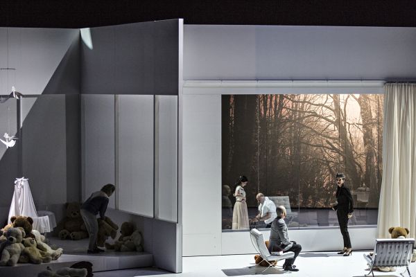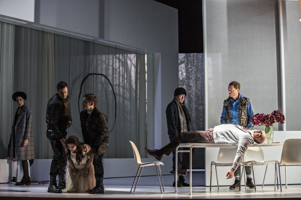 Regisseur Richard Brunel hat die Handlung in die Gegenwart verlegt. Die Saxophonklänge zu Beginn verbreiten eine jazzige Stimmung in einem Bordell, das, als Karaoke-Bar getarnt, so oder so ähnlich wohl überall auf der Welt zu finden sein wird. Gleiches gilt übrigens auch für die Designer-Villa des Steuerpächters Ma, die könnte in China, Russland oder Amerika stehen. (Das Bühnenbild stammt von Anouk Dell’Aiera, die Kostüme von Benjamin Moreau.) Der helle, kühle Hinrichtungstrakt weist vor allem auf Amerika hin. Menschliche Katastrophen ereignen sich hier wie dort. Es ist letztlich auch völlig egal, wo es sich abspielt. Es geht immer um das arme Individuum, das sich gegen menschliche Niedertracht durchsetzen muss und nur in den seltensten Fällen auch siegt. Aber dazu haben wir (oder besser gesagt: brauchen wir) Märchen wie dieses. Sehr im Kontrast zu diesen eher kühlen Bühnenbildern steht dann die Waldlandschaft, wenn Tschang-Haitang im Schneesturm nach Peking getrieben wird, und ihr kleiner Sohn daneben auf einem Schimmel reitend sie begleitet. In diesem Bühnenbild könnten sich getrost auch Lenski und Onegin duellieren.