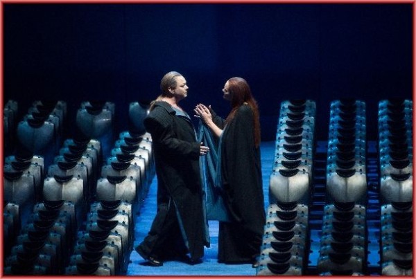 Höhepunkt des Festivals sollte wohl die Neueinstudierung der legendären Inszenierung von Wagners „Tristan und Isolde“ bei den Bayreuther Festspielen des Jahres 1993 von Heiner Müller werden. Dass das leider nicht geklappt hat, lag jedoch nicht an der sorgfältigen Einstudierung durch den seinerzeitigen Assistenten und nunmehrigen Leiter des Schauspiels am Linzer Landestheater Stephan Suschke. Es lag vielmehr an der musikalischen Seite. Zumindest die Premiere stand unter keinem guten Stern. Die Sängerin der Isolde erkrankte, am Tag vor der Premiere flog man eine Ersatzsängerin ein. Am Tag der Premiere erklärte sich Ann Petersen jedoch bereit, trotz ihrer Indisposition zu singen. Ob sie sich und dem Publikum damit einen Gefallen getan hat? Aber natürlich entzieht sie sich damit jeder Kritik ebenso wie der ebenso angeschlagene und entschuldigte Bariton Alejandro Marco-Buhrmester als Kurwenal. Ein Problem stellte aber auch Daniel Kirch dar, der vielleicht ein guter Melot gewesen wäre (sicher ein besserer als es Thomas Piffka war), aber mit dem Tristan schwer überfordert war. Er hielt zwar durch bis zum Schluss, aber die vielen gequetschten Töne (oder besser gesagt Phrasen) waren alles andere als eine Ohrenweide. Christof Fischesser war zufriedenstellend, die Klage des Königs Marke hat man jedoch schon viel eindrucksvoller gehört. Die beste Gesangsleistung des Abends erbrachte hingegen Eve-Maud Hubeaux, die mit ihrem satten, schön timbrierten Mezzosopran eine herrliche Brangäne sang. Das Orchester der Opéra de Lyon, das am Vorabend so eine fulminante Leistung erbracht hatte, war an diesem Abend scheinbar viel unkonzentrierter. Hartmut Haenchen, der auch an diesem Abend am Pult stand, schaffte es nicht annähernd so viel Spannung aufzubauen wie zuvor bei der „Elektra“. Somit verpuffte dieser Abend leider musikalisch völlig.