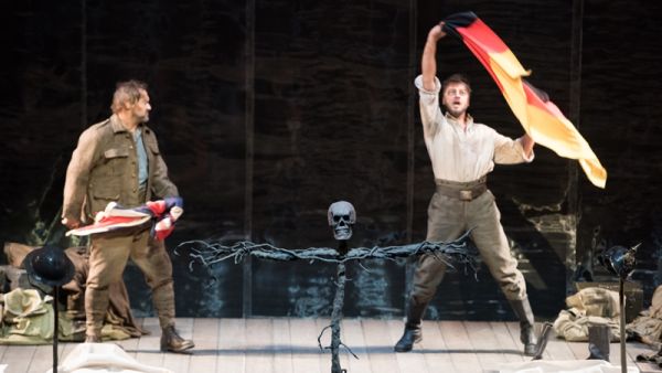Zu Beginn sind in weiße Tücher eingewickelte Leichen gefallener Soldaten aufgebahrt, der Chor (in einfachen Kleidern der Entstehungszeit des Werkes) steht mit Regenschirmen dahinter und betrauert die Toten. Die Sopransolistin ist, jeweils der Situation angepasst, die trauernde Ehefrau/Mutter/Tochter/Freundin, sie legt Blumen auf einen Sarg oder wäscht ein weißes Hemd blutig. Besonders berührend war die Szene, als sie Puppen, die wie verkohlte Kinderleichen aussahen, in die Fahnen der kriegsführenden Staaten eingewickelt hat. Die beiden männlichen Gesangssolisten spielen Soldaten zweier verfeindeter Nationen, die aber gelegentlich sogar gemeinsam Spaß haben können, sich eine Zigarette und eine Flasche Schnaps teilen. (Das erinnert ein wenig an den historisch verbürgten Weihnachtsfrieden von 1914, als sich in Frankreich auf engstem Raum in den Schützengräben französische, schottische und deutsche Kampfverbände gegenüber lagen.