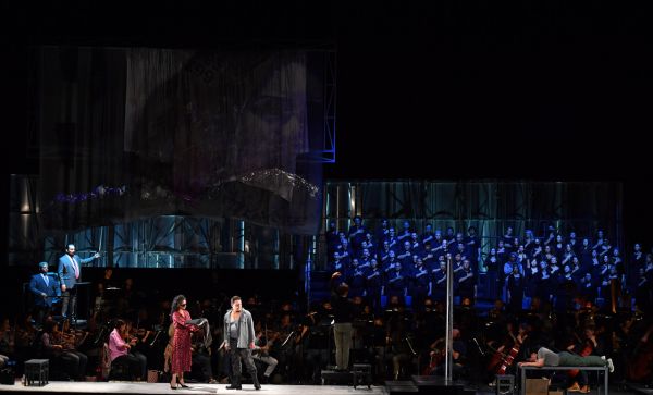 „Halbszenisch“ aber wirkungsvoll: die Sänger auf der Vorderbühne des riesigen „Corum“, vor dem Orchester, dem Chor und einer Video-Leinwand. Foto: Marc Ginot (von der Generalprobe)