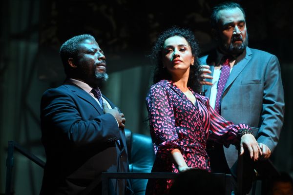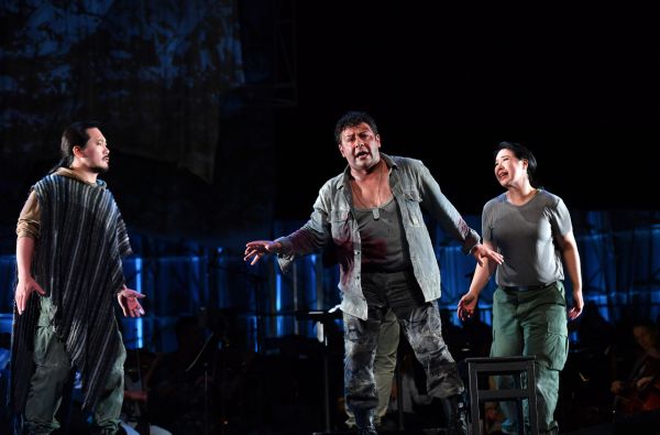 Der Konflikt zwischen Liebe und Vaterland : Leon Kim (Amonasro), Amadi Lagha (Radames) und Sunyoung Seo (Aida). Foto: Marc Ginot (von der Generalprobe)
