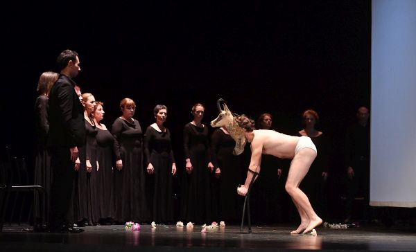 Unter diesen Umständen haben wir nur Lob für den Schauspieler Julien Testard, der souverän als Manfred fast zwei Stunden lang ununterbrochen auf der Bühne agierte, erst als Double von Schumann (?), dann halbnackt als wilder Geißbock in den Bergen, schließlich sterbend als Byron (?) unter einem Sternenhimmel. Wir haben sein Spiel bewundert, aber leider konnten wir ihn oft nicht verstehen. Das kann man nicht von dem exzellent artikulierenden, von Noëlle Gény und Valérie Blanvillain vorbereiteten, Opernchor behaupten, aus dem auch alle Gesangssolisten kamen. Lob für die „Geister“: Christine Craipeau (Luft), Sherri Sassoon-Deschler (Wasser), Jean-Philippe Elleouet-Molina (Erde), Ernesto Fuentes (Feuer) und Laurent Sérou, Xin Wang, Jean-Claude Pacull, Albert Alcaraz (vier Geister).
