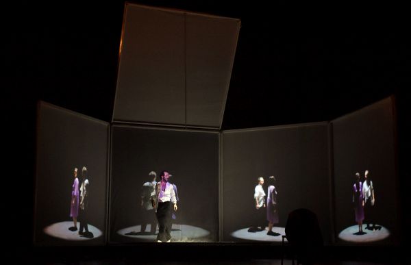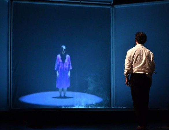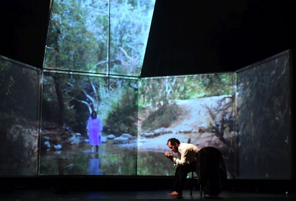 Die italienische Regisseurin Sandra Pocceschi erstellte mit ihrem künstlerischen Partner und Bühnenbildner Giacomo Strada eine eigene Bühnenfassung, indem sie alle gesprochenen Texte zu einem Monolog zusammenstrich. Das haben etliche andere Regisseure vor ihr getan und das hat seine szenische Berechtigung: damit verschwinden unwichtige Nebenfiguren wie der Jäger und der Mönch (die nur wenige Sätze zu sagen haben) und wird die Monomanie Manfreds – um nicht zu sagen „seine Verrücktheit“ – erheblich verstärkt, da er auch sein weibliches Pendant spielt. Das Regieteam hat den komplexen Titelhelden im Programmheft psychoanalytisch ergründet und attestiert ihm drei „Hauptpathologien“: Manfred ist ein megalomaner Melancholiker mit einem Drang zur Selbstzüchtigung, ein Narziss, der sich mit idealisierten Gegenständen identifiziert, und ein libidoreicher Ödipus, der gleichzeitig unter Kastrationsängsten leidet. Um dies alles auf einer Bühne darzustellen, haben Pocceschi und Strada einen Stoff-Kubus gebaut, in dem Manfred sich räumlich einschließen kann und der zugleich auch die Projektionsfläche für ein fast abendfüllendes Video ist (sehr schöne Bilder des Studio Ancarani). Wir hören Manfred (mit Mikrophon) auf Französisch mit den Naturgeistern reden, die ihm auf Deutsch singend aus dem Off oder aus dem Saal antworten.