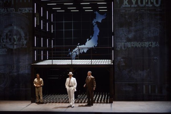 J. Robert Oppenheimer (deutscher Abstammung, der im richtigen Leben in Göttingen promoviert hat) tritt im weißen Anzug und Hut wie im Urlaub auf, immer an einer Zigarette ziehend, um seine innere Unruhe zu dämpfen (am 18. Februar 1967 starb Oppenheimer an Kehlkopfkrebs!). Eine Atombombe auf japanische Zivilisten; das stört ihn nicht: es muss der größtmögliche psychologische Eindruck erzeugt werden. (Später hat Oppenheimer seine Meinung unter dem Eindruck des Geschehenen geändert und kam ins Visier der McCarthy-Ära.) Dietrich Henschel gab in dieser großen Rolle eine Glanzpartie mit überzeugender Bühnenpräsenz und seinem kräftigen dunkel grundierten und sehr kultivierten Bariton. Edward Teller ist der Zyniker, der sich nicht voll in den Dienst des Projekts stellt. Robert Bork mit mächtig und finster strömendem Bassbariton verlieh dieser schillernden Figur Glaubwürdigkeit und Profil. (Teller, der Vater der Wasserstoffbombe, kam aus Ungarn und hat sich später durch Quertreiberei und Denunziation unbeliebt gemacht.) Marlin Miller, klein erscheinend gegen die hochgewachsenen Vorgenannten, sang den von Gewissensbissen geplagten Robert Wilson mit hellem, klar konturiertem Charaktertenor. Mit Peter Sidhom als General Leslie Groves war ein stimmgewaltiger sonorer tiefer Bariton besetzt, der wie ein Popanz seine Schwäche hinter scharfem Befehlston versteckte und insgesamt recht einfältig wirkte. Brian Bannatyne-Scott spielte und sang den eingeschüchterten Fachidioten Jack Hubbard, der im Wesentlichen als Chefmeteorologe nur den Wetterbericht zu verlesen hatte und das mit verlässlichem, kernigem Bass tat. Mit klarem baritonalem Tenor gestaltete John Graham-Hall in einem einzigen Auftritt die kleine Rolle des Captain James Nolan.