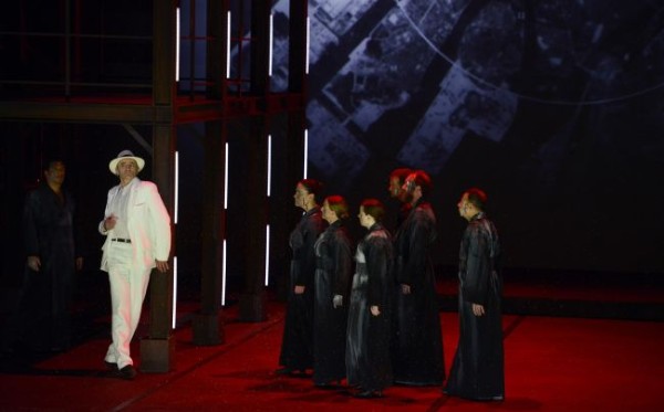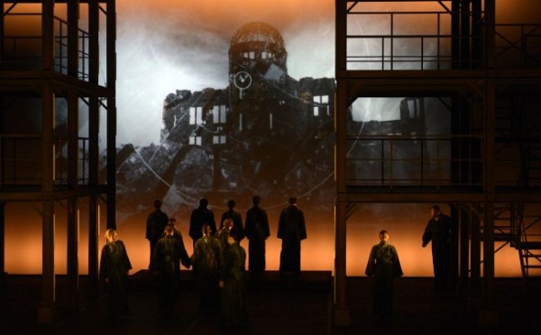 Unter der Leitung von Patrick Davin musizierte das Orchestre symphonique de Mulhouse in großer symphonischer Besetzung und bot eine tadellose Leistung. Zu einem gut ausgewogenen Verhältnis zwischen einem fast 40-köpfigem Streicherapparat und 24 Bläsern, bei denen die ganz tiefen Holzbläser (Kontrabassklarinette und Kontrafagott) dunkle Klangpunkte markierten, kamen noch ein verstärktes Schlagwerk, Harfe und Celesta, so dass die sorgfältig und reich durchorchestrierte Partitur insgesamt sehr gut ausbalanciert wirkte. Adams‘ Klangbild fußt noch in spätromantischer Opulenz, steht aber auch deutlich hörbar in der Nachfolge der amerikanischen Symphonik der ersten Hälfte des letzten Jahrhunderts und verarbeitet diverse komplexe rhythmische Einflüsse. Zu den teilweise dramatischen Aufwallungen des Orchesters kamen noch Geräusch- und Elektronikeinspielungen aus dem Zuschauerraum, die den Eindruck des Kriegsgeschehens verstärkten. Sehr gut gelang es dem Orchester, immer wieder die unter den Beteiligten herrschende Unruhe darzustellen und zum Schluss mit einer Motivik, die der minimal music entlehnt ist, die enorme Anspannung vor dem großen Experiment zu verdeutlichen. Ostinatoartig kommen in leichten Abwandlungen kleine Schlagwerkmotive, die sich in einem langgezogenes Crescendo steigern. Auch die breit angelegten Chorsätze sind prägend für diese Oper, wobei sich erstaunlicherweise gleich zu Beginn nur der Frauenchor zu den neuen Erkenntnissen der Quantenphysik äußert. Den bestens einstudierten chœurs de l’opéra national du Rhin (Leitung: Sandrine Abello) gehört auch der beeindruckende und nachhaltige Schluss der Oper. Während die Zeit, der Count-down, in den genannten Schlagwerkostinati zu irrealer Dauer und Spannung gedehnt wird, möchte man sich in Erwartung des Atomblitzes des trinity test (16.07.1945) am liebsten in die Sessel drücken. Aber die Regie geht mit Hilfe einer Videoprojektion in eine Überleitung und vollführt einen Zeitsprung von einem Monat auf den 15.08.1945. Little boy (welch zynische Verniedlichung!) hat Hiroshima zerstört, der große Chor tritt mit verrußten Gesichtern und verbrannter Kleidung auf und ruft vor dem heute noch stehenden Ruine des Kuppelbaus nach Wasser. Eines der größten Verbrechen der Menschheit wurde auf der Bühne in Erinnerung gerufen.