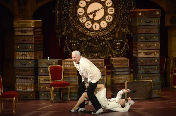 Statt Statisten mischen Bewegungskünstler die Szene auf. Und wenn noch das zwölfköpfige Ballett dazukommt, ist die Bühne mit einem bunten wogenden Völkchen gefüllt. Die Tänzer geben nicht nach dem Motto: „Achtung, jetzt kommt Tanz!“ Balletteinlagen, sondern integriert ins allgemeine Bühnengeschehen verleihen sie diesem mehr Lebhaftigkeit; natürlich sind sie zumeist ganz vorne tätig, damit der Eindruck entsteht, dahinter gehe es genauso turbulent zu. Karikiert bis zum Surrealismus wird das bunt gemischte Personal im Bahnhof im ersten Akt mit immer neuen Überraschungen bewegt. (Choreographie: Philippe Giraudeau). Dabei spielen auch die hundert Koffer eine Rolle, welche die Reisenden mitgebracht haben und aus denen von einer Bahnhofsbank bis zur Tour Eiffel die ulkigsten Requisiten zusammengesetzt werden und im zweiten Akt gar in Gardefeus Salon die Réception der Hotel-Dépendance gebaut wird. Es gibt den ganzen Abend über immer etwas zu sehen – eine rundum gelungene Regiearbeit.