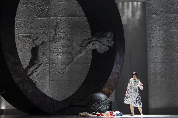 Zentrales Bühnenelement der Inszenierung, die Stefano Poda selbst ausgestattet und beleuchtet hat, ist ein riesiger Steinring, der optisch beeindruckt und an das Bühnenbild des Mindener „Ring des Nibelungen“ erinnert. Der dortige Ring ist allerdings unbeweglich, während man in Liege das Ungetüm dank perfekter Hydraulik sogar auf die Kante stellen kann. Dann nimmt er das ganze Bühnenportal ein.
