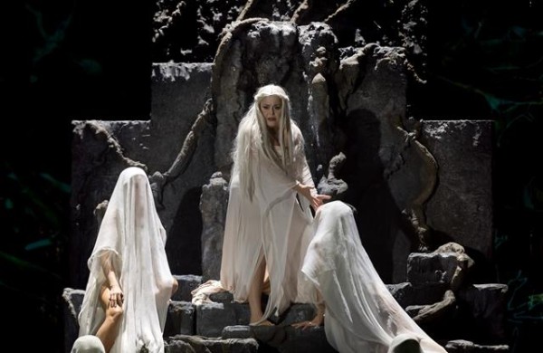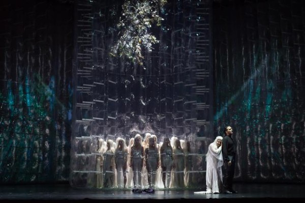 Die stimmungsgebenden Videoeinspielungen von Sergio Metalli versetzen uns im zweiten und dritten Akt in eine Pseudowelt, die die eingesperrten Frauen nur durch die Folie wahrnehmen, eine Wirklichkeit, die nur vorgegaukelt wird und unwirklich bleibt. Das komplett gegebene Ballett wird auf zwei Tänzerinnen reduziert, die in der Choreografie von Luisa Baldinetti packend das Schicksal der Frauen erzählt. Das mag zusammen für eine schöne Bilderschau taugen, für eine überzeugende Botschaft reicht es nicht. Mit „Ich weiß nicht, was soll es bedeuten“ kommt mir da schon die zweite Loreley-Assoziation. Rosetta Cucchi hat mit ihrer Lesart wahrscheinlich mehr für die Polyethylenindustrie als für Donizettis vernachlässigtes Werk getan.
