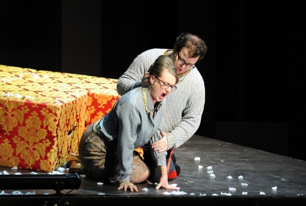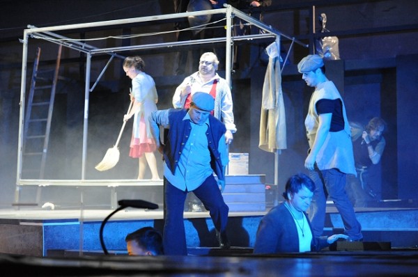 Begonnen wird mit „Bajazzo“ von Ruggero Leoncavallo und nach der Pause kommt „Il Tabarro“ – „Der Mantel“ von Giacomo Puccini. Die Inszenierung hat Verena von Kerssenbrock übernommen und sie baut eine schlichte einfache Bühne, die für beide Stücke mit wenigen Handgriffen umgestaltet werden kann. Zusammen mit Wiebke Horn zeichnet sie auch für die Kostüme verantwortlich und auch hier können sie beim mitgehenden Publikum punkten. Schnörkellos, dafür umso beeindruckender läuft die Mär um Liebe und Eifersucht ab und zieht die Zuhörer in ihren Bann. Der „Bajazzo“ beginnt mit einem Paukenschlag, dem kraftvoll und leidenschaftlich gesungenen Prolog, mit welchem sich Jacek Strauch stimmgewaltig einführt und diese Leistung kann er in der Verkörperung des liebestrunkenen, schmierigen und zuletzt hasssüchtigen Tonios, dem Tölpel, der das tragische Ende einläutet, halten. Sein kräftiger voller und stimmschöner Bariton weiß zu überzeugen. Er, der in Nedda, der Frau Canios, des Bajazzos verliebt ist und von ihr zurückgestoßen wird, sinnt auf Rache. Er schürt die Eifersucht Canios, der nicht weiß, dass der junge Silvio der heimliche Geliebte Neddas ist. Im komödiantischen Spiel vor versammeltem Publikum verschwimmen Wirklichkeit, Realität und Spiel. Canio kann nicht mehr dazwischen unterscheiden und ermordet vor der entsetzten Menge sowohl seine Frau Nedda als auch den jungen Silvio. „Geht heim – das Spiel ist zu Ende“ setzt den Schlusspunkt über ein tatsächlich geschehenes Verbrechen, welches von Leoncavallo vertont worden war.
