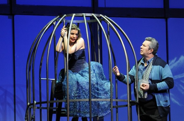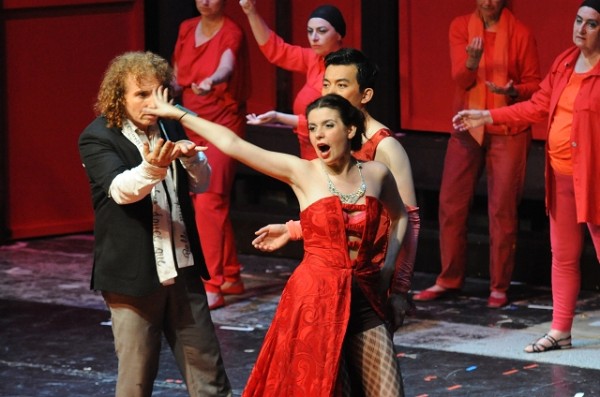 Hoffmann wird von Niclas Oettermann gegeben und obwohl ich anfangs etwas skeptisch war, hat er mich mit seiner Interpretation voll überzeugt. Sein nobler, weicher, aber auch zum metallischen Strahlen gelangender Tenor ist in jedem Moment präsent, ebenso wie sein differenziertes und überzeugendes Spiel. Er bringt den zerrissenen taumelnden und sich selbst zerfleischenden Dichter eindrucksvoll auf die Bretter. Eindrucksvoll ist auch sein weiblicher Gegenpart, die Sopranistin Tatiana Larina, die alle vier Frauenpartien, die sehr unterschiedlich angelegt sind, verkörpert. Und dies tut sie mit Bravour. Die junge Russin stellt sich stimmlich überzeugend auf die Puppe ohne Seele Olympia ein, ebenso wie auf die lenkbare und sensible Sängerin Antonia, auch die Kurtisane Giuletta, die kühl und männermordend bzw. seelenstehlend auftritt, kann sie glänzend verkörpern. Ihr schöner geschmeidiger und ausdrucksstarker Sopran passt sich den unterschiedlichen Rollen optimal an, insgesamt gesehen ein total gelungener Auftritt. In der Rolle der Bösewichte Lindorf, Coppelius, Dapertutto und Dr. Miracle weiß Rhys Jenkins zu überzeugen. Vor allem mit seiner Spiegelarie kann er beim Publikum punkten. Der Waliser bringt eine überzeugende Leistung in allen Rollen Sein durchschlagskräftiger vollmundiger Bariton weiß zu überzeugen und das Publikum zu begeistern. Als Muse/Niklausse ist Antonela Barnat eine überzeugende Besetzung. Die Mezzosopranistin, die den vergeblichen Kampf kämpft Hoffmann vor sich selbst zu schützen bietet eine gute Vorstellung, sowohl vom stimmlichen als auch vom darstellerischen her. Der junge Tenor Bonko Karadjov weiß das Publikum als Andrés, Spanlanzi und Frantz zu überzeugen und teilweise auch zu Lachstürmen hinzureißen. Seine kleinen Auftritte macht er zu kleinen Paradestückchen und kann auf der ganzen Linie punkten. In den weiteren Rollen überzeugen Yang Li als Hermann und Schlemihl, Kirill Borchaninov als Crespel und Luther und Petri Vesa als Pitichinaccio.