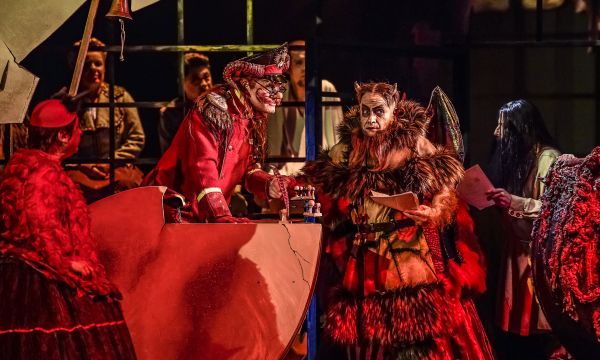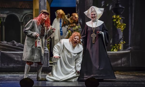 Beide Häuser haben anscheinend einen ordentlichen Ausstattungsetat für die Produktion locker gemacht, wie es sich für ein „Schaustück“ auch gehört. Engagiert wurde mit Hinrich Horstkotte in Personalunion als Regisseur und Ausstatter jemand , der so etwas auch kann, der Schauwert ist sehr opulent mit richtig schönen, gemalten Hängekulissen, was sich heutzutage ja fast niemand mehr traut. Das Höllenbild erinnert in roter Phantasie an tschechische Märchenfilme, das Kloster zitiert historische Bühnenbilder von Meyerbeers „Robert der Teufel“, was der nüchterneren Szene der Kaserne und der Tanzschule entspricht wird jeweils durch die Kostüme und Aktion wieder aufgefangen, grandios das Finale mit dem „teuflischen“ Opernball.