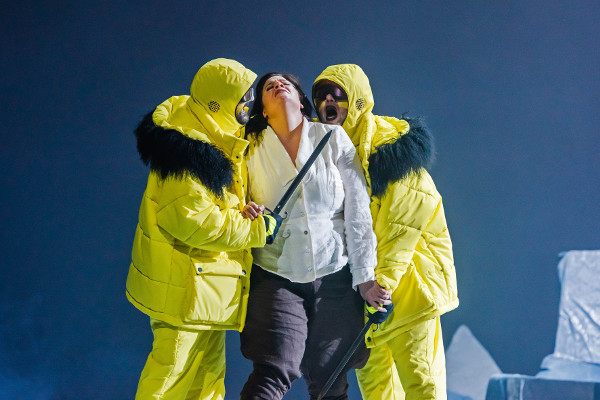 Man hat auch schon dümmere, dramatisch plattere, wesentlich spannungslosere „Götterdämmerungen“ als diese erlebt. Der Tipp der Freundin, derzufolge diese „Götterdämmerung“ szenisch an Chéreaus Version des Schlussstücks der Tetralogie heranreiche (hört hört!), war goldrichtig – denn von Akt zu Akt wurde das Geschehen bannender, um nicht zu sagen: konsequenter und zugleich herzzerreißender. Um nur ein paar Markierungen zu nennen: die Nornen wesen im arktischen Eis vor sich hin und halten das Wissen um die Welt nur noch durch Plastiktütensniffen aus. Aus Siegfried, dem unbefangenen Liebsten der Brünnhilde, wird ein nervös vor sich hin stromernder Junkie, immer auf dem Glatteis zwischen Schluck und Schluck. Hagen ist ein Getriebener, kein einschichtig „Böser“, wenn auch böse in seiner Vernichtungssucht. Waltraute predigt ihrer Schwester vergeblich, am Ende kniend das Schicksal der Götter – und Brünnhilde, die von all dem nichts wissen will, bricht plötzlich, als von ihrem Vater die Rede ist, in ein Schluchzen aus, das klüger und beklemmender ist als ihre gesamte Abwehr. Siegfried und Gunther treten wie in einem romantischen Horror-Roman (Wagner liebte E. T. A. Hoffmann) als Doppelgänger in arktischer Schutzkleidung auf, die Frau schrecklich entwürdigend.