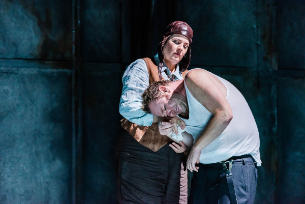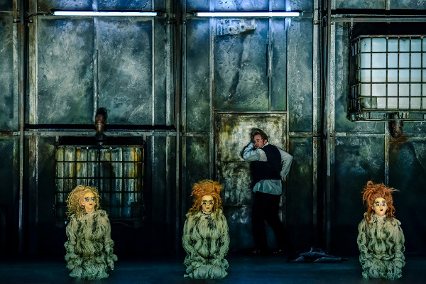 Und die Hauptsache, die Musik? Zugegeben: Daniel Kirch singt einen relativ dunklen Tenor, trifft am Abend auch nicht jeden Ton, aber nach dem vorgestrigen „Siegfried“ wundert man sich eh über seinen ungeheuren vokalen und szenischen Einsatz. Auch eine Erstaunlichkeit: Stéphanie Müther vermag noch im Finale zu gestalten und in den höchsten Exaltationen der Brünnhilde schön zu singen – ganz abgesehen vom Drama, das sie mit Vehemenz und Subtilität herausspielt. Ich denke nur an ihr Mienenspiel beim Beschluss, ihren treulosen Geliebten zu ermorden. Kirch und Müther sind ein Traumpaar dieses „Ring“: mit einem Zusammenspiel, das auf „Ring“-Bühnen so intensiv und verflochten eher selten zu sehen ist. Die Gutrune der Cornelia Ptassek gehört zu den weiteren Glanzpunkten dieses Abends. Gesegnet mit einer leichten Schärfe, unterstützt ihre Stimme die ein wenig kühle und doch empfindsame Aura dieser betrogenen und szenisch zurecht zur Hauptfigur aufgewerteten Frau, die sich gleich Gunther in der neusachlichen Gibichungenhalle vom ewigen Barkeeper Hagen benebeln lässt (ich kann mich an keine „Götterdämmerung“ erinnern, in der so viel ausgeschenkt wurde…). Ptassek gehört auch zu den Nornen, einem Dreamteam eines Terzetts, für das das Wort „homogen“ erfunden wurde: Anja Schlosser, Sylvia Rena Ziegler und Cornelia Ptassek. Von gleicher Qualität: die Rheintöchter Yang, Ziegler und Sophia Maeno, drei Rheinfrauen, gewandet in Kleider (entworfen von Gesine Völlm) aus Flusstang, drei Wesen zwischen deformierter Natur und halber Kultur. Waltraute ist die phänomenale Anne Schuldt, Alberich der an diesem Abend erstaunlich hoch und dramatisch genau singende Jukka Rasilainen, Marius Bolos sein nicht allzu basslastig, doch dunkel genug dräuender Albensohn und Pierre-Yves Pruvot ein meist seine Stimmorgane pressender, doch angemessen verzweifelter Gunther auf seelischen Hochtouren. Völlig unabhängig also davon, wie hell oder dunkel oder pressend hier gesungen wurde: die Sänger/Schauspieler einte Eines – der Wille zum packenden Musikdrama.