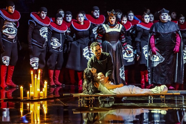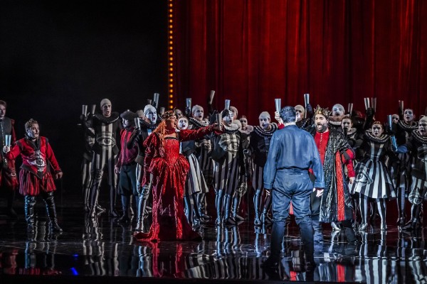 Die Oper Chemnitz übernahm die Bregenzer Arbeit mit dem gefragten Regisseur nebst dessen Ausstatter-Team für eine deutsche Uraufführung und brachte eine faszinierende Inszenierung auf die Bühne. Die Handlung springt mit dem Krönungsfest und einem Trinklied des neuen Königs mitten ins Geschehen. Diese Feststimmung mit dem Trinklied kehrte im Schlussakt wieder, wobei sich die Situation zur allseits bekannten skurrilen Mordserie entwickelt. Damit erhält die Handlung einen Rahmen, in dem Olivier Tambosi den traurig-zögerlichen Prinzen als den Rächer, den Liebhaber, den Sohn, den Philosophen, den Intriganten und den Theaterkritiker in jedem Part Glaubwürdigkeit verschafft. Die Bühne des Frank Philipp Schlößmann und die historisierten Kostüme der Gesine Völlm streng in Rot-Schwarz-Weiß sowie eine gekonnte Lichtregie des Davy Cunningham schaffen eine permanent gespenstige Grundstimmung. Eine Ausnahme bietet nur das in Grün-Beige gestaltete Schauspiel, von Boito als Persiflage auf das Opernwesen seiner Zeit gestaltet. Mit gekonnter Personenführung, intensiver Einbeziehung des perfekten Chores, der Tänzerinnen und kreativer Nutzung der Drehbühne schafft er, die übrigen Protagonisten mit Hamlet in Beziehung zu bringen. Da ist vieles konzentriert, bündig und schlagkräftig. Vor allem ab dem dritten Akt steigert sich die Aufführung. Die Musiker der Robert-Schumann-Philharmonie mit dem Dirigat des Dan Raţiu bringen neben einer ausgereiften Sängerbegleitung vor allem die den Schöpfern der Oper so wichtige sinfonische Ausmalung der Partitur zur Geltung.